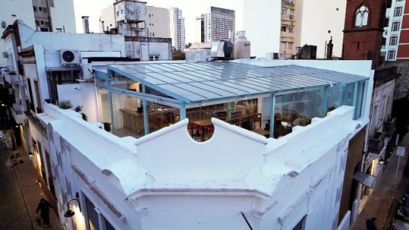 Luego de tres años de obra y planeamiento, el 8 de julio abrieron las puertas de La terraza de la Carbonera. El edificio de la esquina de Balcarce y Carlos Calvo data del 1800 y carga con varias remodelaciones a cuestas. La fachada rústica esconde un ambiente cool y moderno. Para llegar al restaurante se accede por la calle Carlos Calvo. Un recibidor con ventanales de colorido vidrio repartido de piso a techo abraza la escalera que guía hacía la terraza.