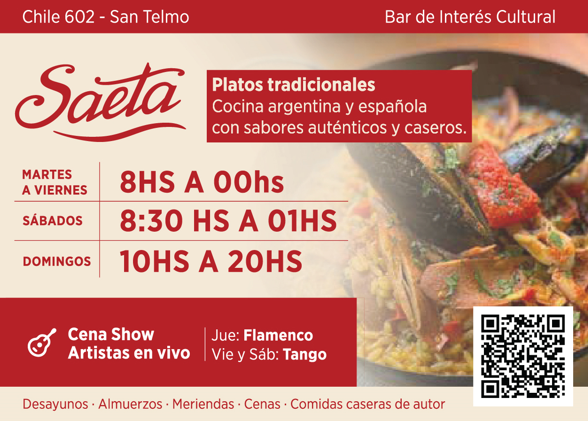 Cerca de Saeta está la escultura de Mafalda y sus amigos, el Zanjón de Granados, Pasaje San Lorenzo y la Casa del Esclavo Liberto (Casa Mínima). También podés vistar el Museo del Traje.